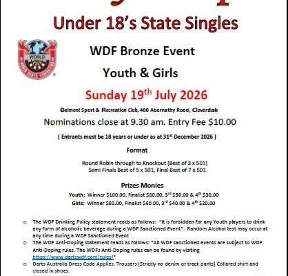 Sponsorship of this event to be confirmed…. Electronic nominations close Friday 2nd October 2026 at 5:30pm, or email the Events Co-ordinator at dartswaregistra@gmail.com Please advise the Games Co-ordinator that you have arrived at the venue before 9:30am, this will ensure you are included in the draw. If you have nominated...
